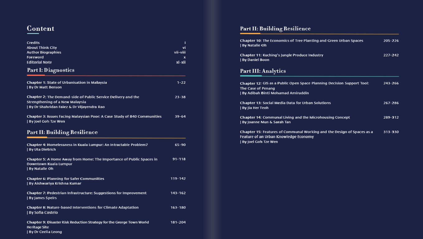 Urban Solutions for Malaysian Cities is compiled by a team of Malaysian urbanists, researchers, and practitioners who specialise in sustainable development and city planning. Their combined expertise spans architecture, landscape design, urban governance, transport policy, environmental management, and community-based development.